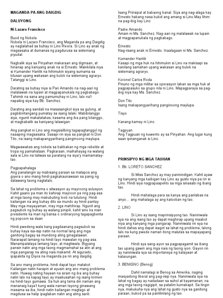 Through Maganda pa ang Daigdig readers are given a clear picture of how vulnerable farmers are in the society having landlords and other high-ranking authorities holding them by the neck. Batas at bayan ang kanilang panginoon at tayoy bahagi ng bayang pinaglilingkuran nila. Buod ng maganda pa ang daigdig ni lazaro francisco.
